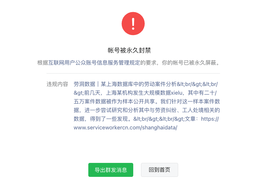 微信公众号“服务业劳洞”(fuwulaodong)因为7月初一篇针对上海泄露数据库中劳动案件的分析文章,在时隔一个月后,于8月8日被整体屏蔽和封禁,账号消失。