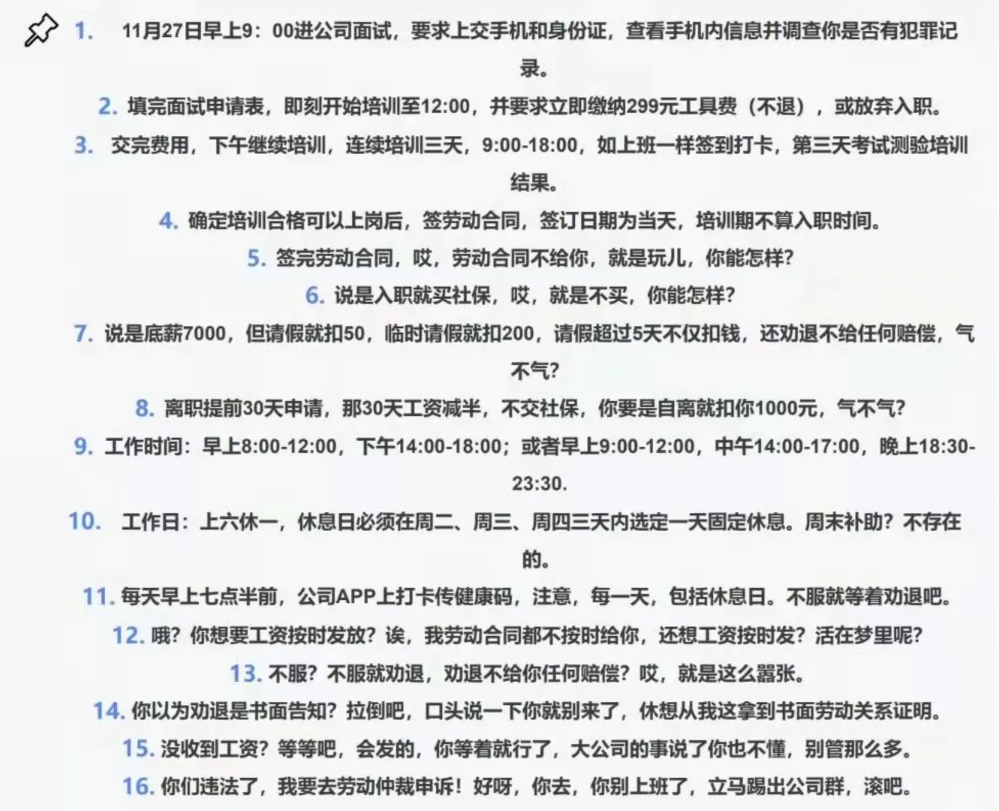 据爆料,“轻松到家”存在着以下违法用工的行为,包括:侵犯员工隐私、拒绝劳动合同副本由员工持有、不缴五险一金、请假肆意扣钱、克扣工资、不按时发放工资、恶意辞退工人等。