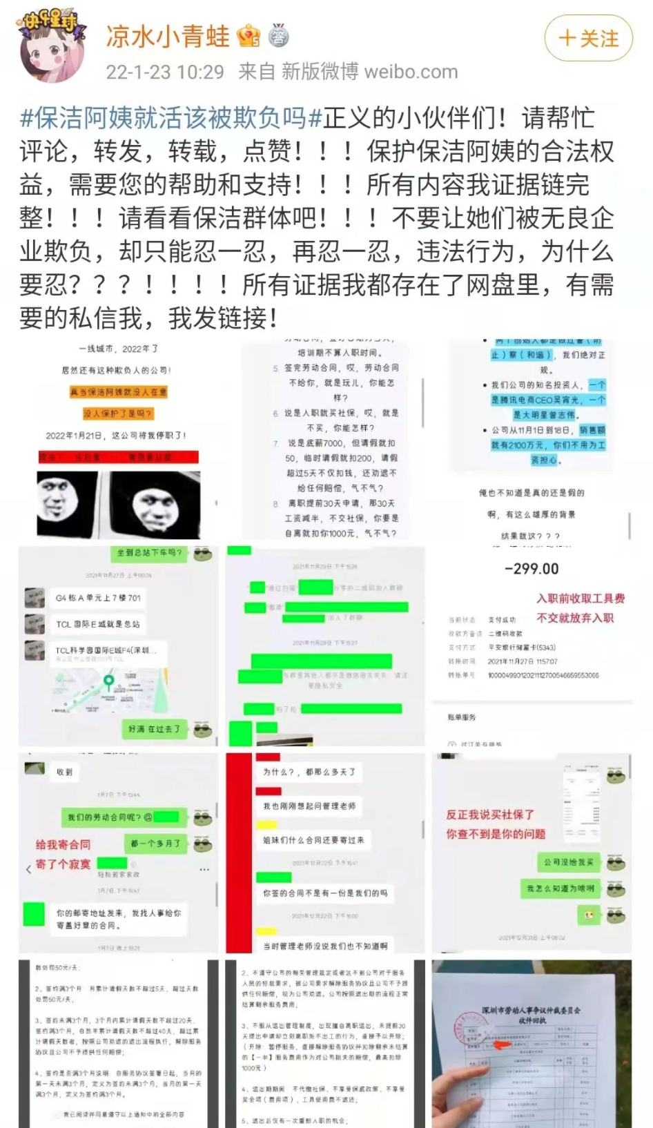 博主“凉水小青蛙”于2021年11月30日入职“轻松到家”成为一名全职保洁师,在工作过程中,她发现了公司存在多项侵犯员工权益的行为,并且遭到工资拖欠。在向管理层申诉公司的违法行为后,她被踢出员工群,并被违法开除。博主表示在“轻松到家”工作的保洁阿姨的权益普遍遭到了侵害,只是碍于年纪较大、文化水平不足等原因无法发声。
