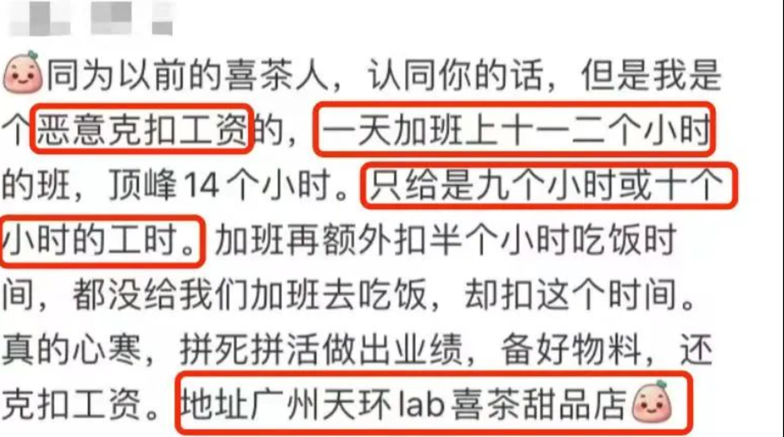 尽管后来喜茶官方声称公司不存在大裁员,而是年前的正常人员调整优化,但在小红书、微博、脉脉等社交平台上却有自称喜茶员工或前员工的网友发帖称自己遭遇了公司压工时、“砍班”等操作,被迫离职。根据媒体《天下网商》对喜茶离职员工的采访,喜茶的裁员从去年10月份开始就初现端倪。喜茶规定一线员工每月总工时需达到200小时,但在排班上却严格压缩员工工时,甚至少计工时,导致部分员工被扣底薪与全勤补助,甚至有员工因工时不足遭开除。此外,N+1的裁员补偿也并非对所有被裁员工落实到位。