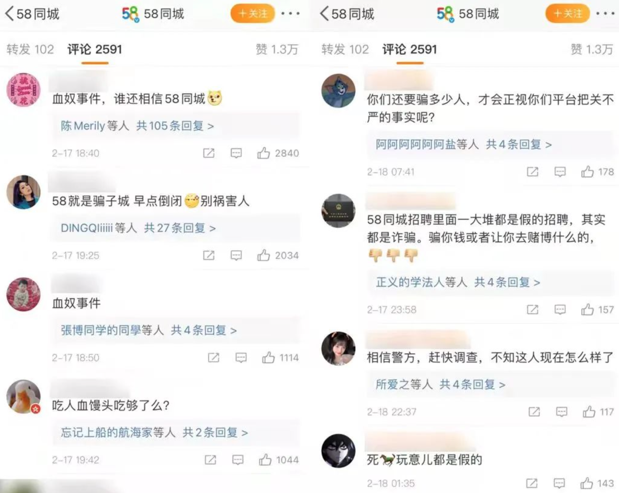 尽管后来“58同城”及警方经过调查否认了该男子遭遇的真实性,但此事件引发了公众对“58同城”等平台虚假招工信息泛滥的关注。“58同城”的微博评论区被愤怒的网友攻陷,大量网友在微博上分享自己的被骗经历。