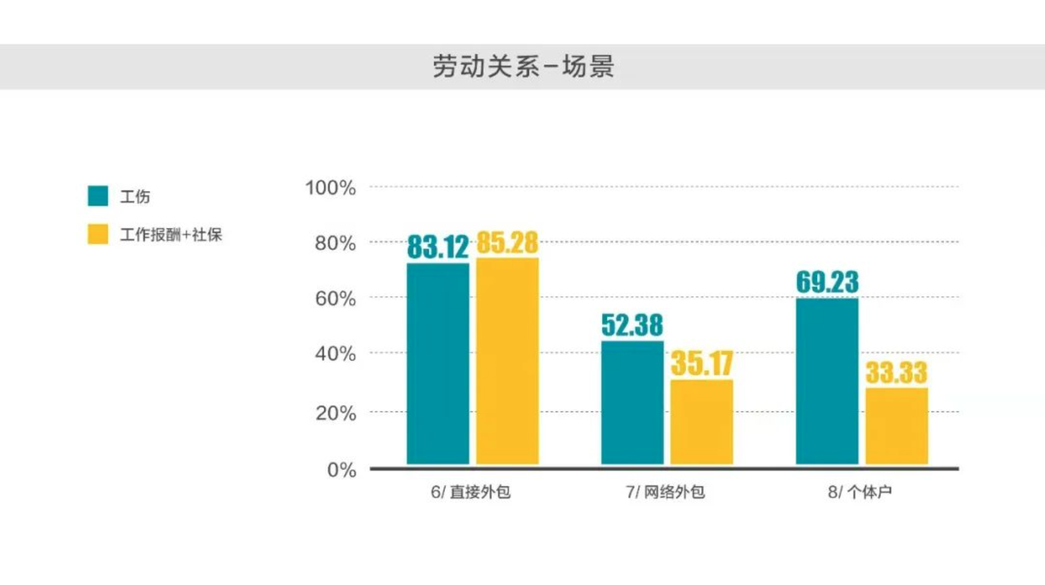从图中可以看出,随着外卖市场垄断趋势的发展,用工形式随之变化。外卖平台在垄断优势下无需再以比竞争对手优厚的待遇去招聘骑手。图中数据亦清楚显示,劳权纠纷的判决数量呈每年上升趋势,其中判决数量最多的是骑手受外包配送商管理、发放工资的“直接外包”用工形式,数量排第二的则是“网络状外包”形式。然而,由于“网络状外包”的用工形式中,劳动关系的错综复杂也有可能使得骑手求助无门,劳权纠纷甚至无法立案,判决数量相对较低可能是一种“幸存者效应”,同理众包骑手较低的判决数量背后也可能有类似原因。报告中涉及到的大部分判决来自专送骑手——即客观上建立劳动关系,受严格劳动管理的全职骑手。但即使是这样,在“直接外包”的用工形式下,骑手的劳动关系认定率为85%左右,在“网络状外包”的形式下,劳动关系认定率降到了35%~50%,可见“网络状外包”的用工形式在相当程度上为雇主逃避了责任。