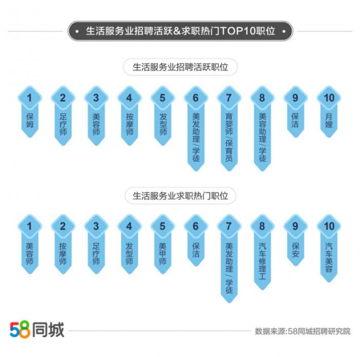 今年4月,生活服务业招聘需求前十的职位分别是保姆、足疗师、美容师、按摩师、发型师、美发助理、育婴师保育员、美容助理、保洁、月嫂。其中,保姆招聘需求同比上升最快,其次为育婴师保育员,招聘需求同比增长31.34%。
