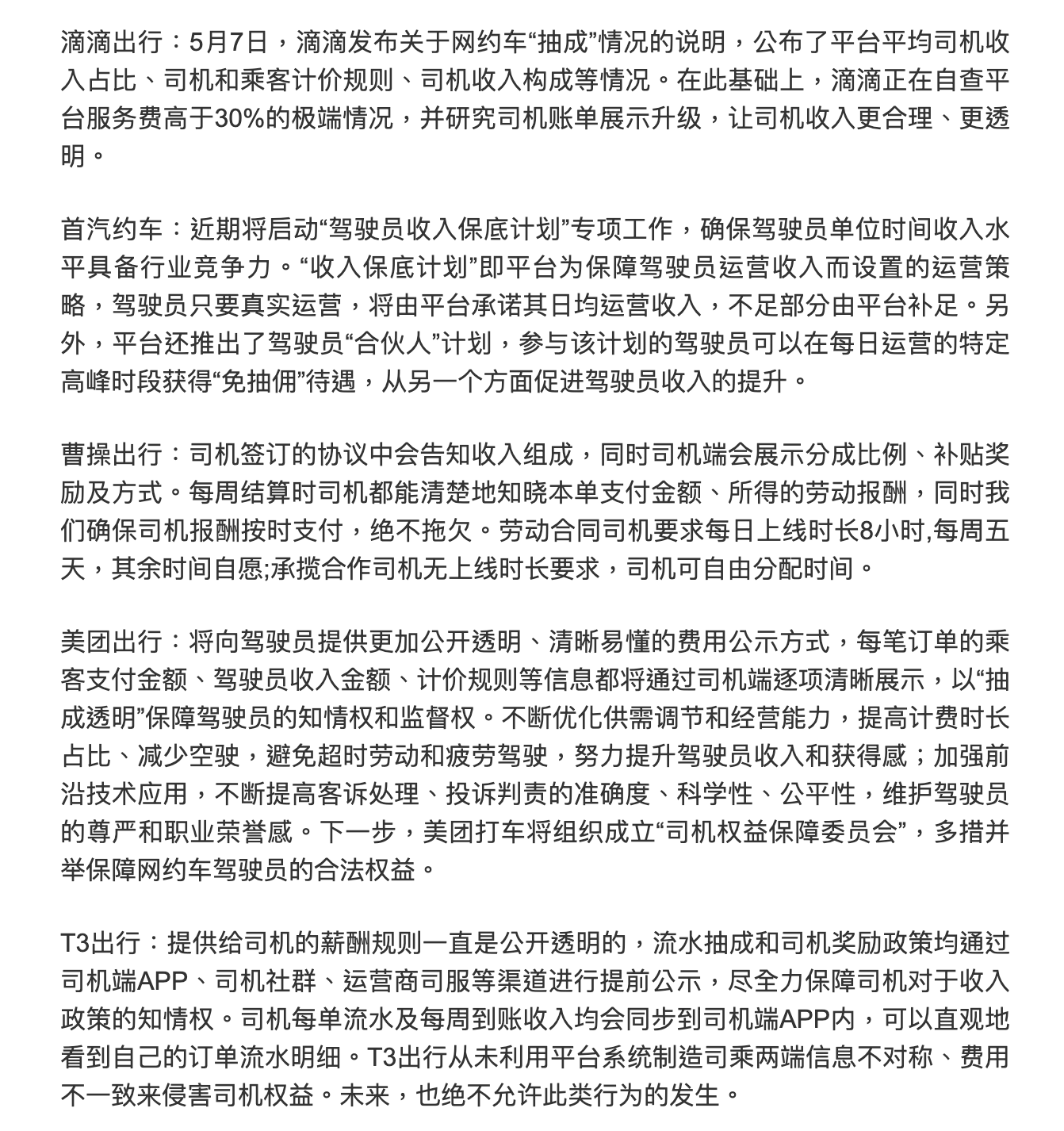 5月14日,交通运输部、中央网信办、国家发展改革委、工业和信息化部、公安部、人力资源社会保障部、市场监管总局、国家信访局等交通运输新业态协同监管部际联席会议8家成员单位,联合约谈10家网约车平台,要求各平台从合理确定抽成比例和信息服务费水平、整改侵害从业人员权益的经营行为、改善司机经营环境、坚守安全稳定底线等方面立即展开整改。