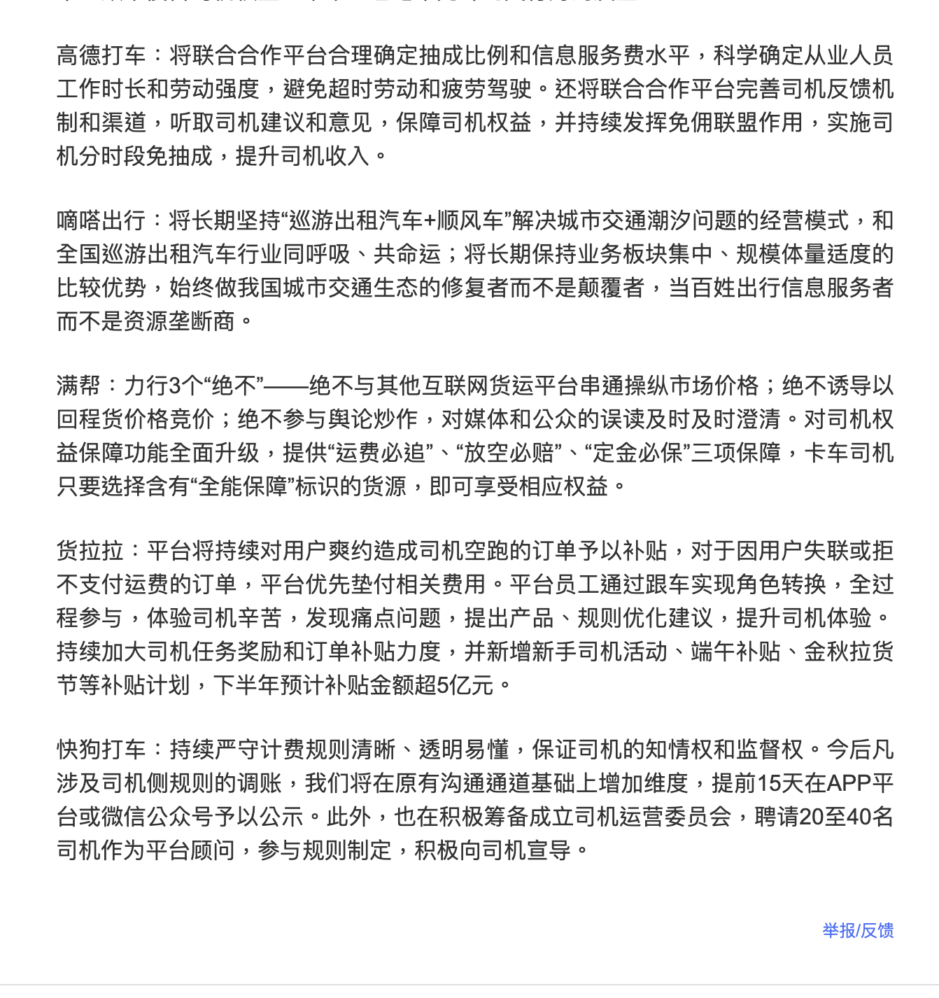此外,继被多部门统一约谈后,5月20日货拉拉发布《关于保障和提升货车司机权益的承诺书》,承诺内容涵盖:稳定货运价格、特殊期间减免会员费、制定补贴计划,下半年补贴司机超5亿元、收集司机建议、改善司机劳动环境、优化司机处理机制。