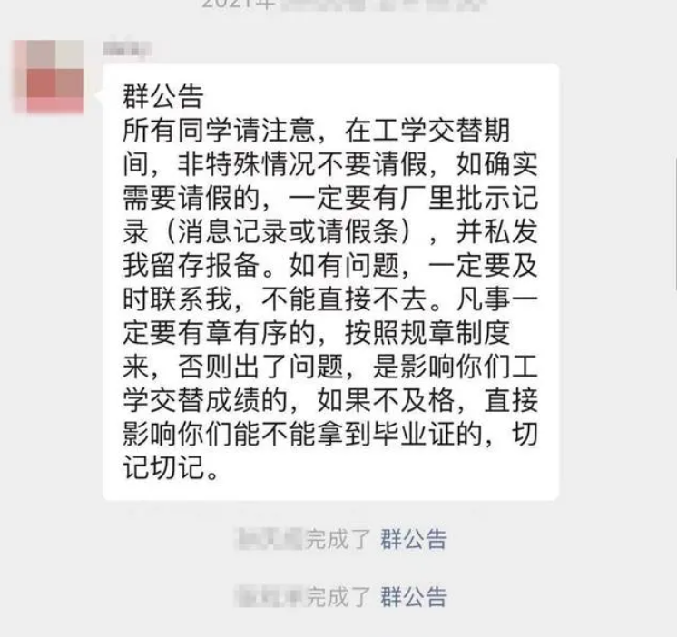 据了解,这类实习安排在该校的人才培养方案里叫“工学交替”和“顶岗实习”,但在实际操作中,学生表示两者没有任何区别,就是到工厂里干活,而且没有任何商量的余地。虽然有驻厂老师,但平时没事看不到他人,更谈不上学校老师的全程指导了。而更重要的是,盐城技师学院安排的实习岗位经常和所学专业没有任何关系。“老师说这是一门课程,不坚持下来,毕业证书不给你发,强迫我们留在(厂里)。”