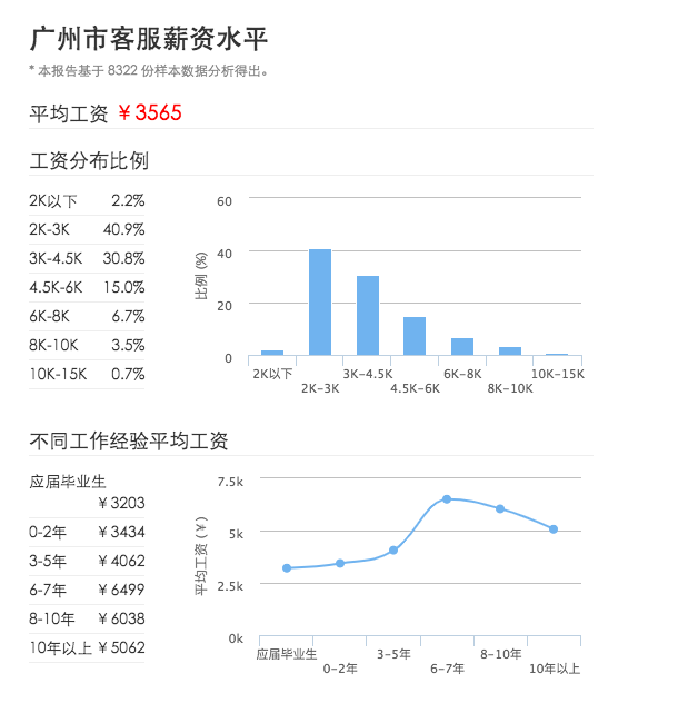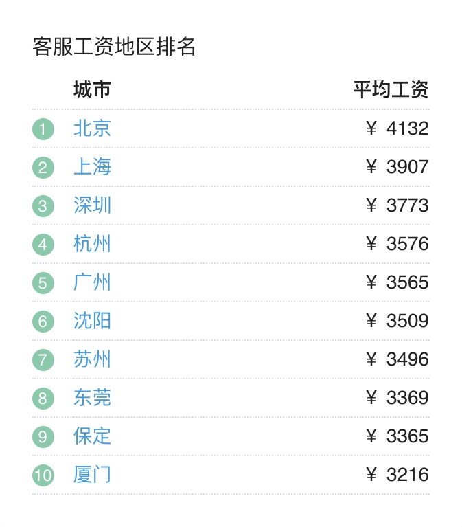 从薪资计算器(salary calculator)网站上查询到的公开资料显示,广州市客服平均每月薪资水平在3500元左右。其中,2000-3000元的工资分布占了最重的比例,高达40%。而客服的工资地区排行榜中,除了北京平均月薪超过4000元外,其他排在前十的城市客服平均工资都在三千多。在上海深圳等房价物价高的城市,这样的工资水平很难说能维持体面的生计。
