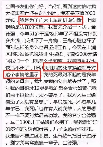 让我们再次回到这次悲剧事件本身。根据交通运输部《道路运输车辆动态监督管理办法》第37条和第38条,丰润区治超站要想对金德强的行为定性,有两种选择——“卫星定位装置出现故障不能保持在线且拒不改正”与“破坏卫星定位装置”——而治超站选择了后者,即二者中更严重的那一个。至于这个定性是否合理,只需看看唐山官方调查通报中严谨使用的“咨询”一词(暗示2000元并非正式处罚)即可略见端倪。除此以外,大江网经过调查发现:金德强自杀所在区域的交通执法频频遭到货车司机投诉。