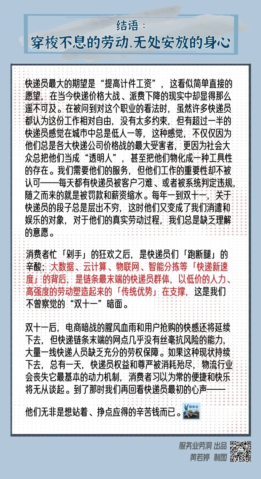 快递员超时工作(无加班费)是常态。大部分快递员早上6:30-7:00就出⻔上班,晚上8:30以后是他们结束工作的高峰期。
