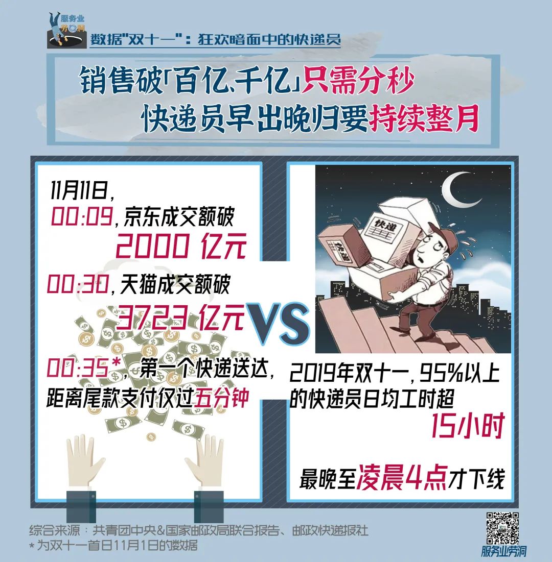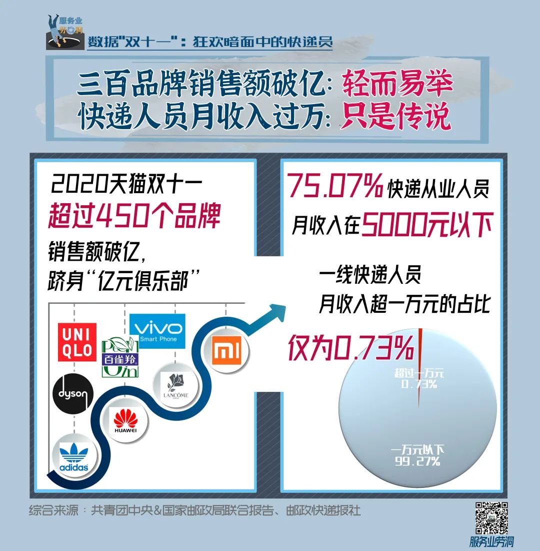 他们一直在“双十一”的暗处。购物节的狂欢当下,多地相继爆出一线快递人员罢工讨薪、快递基层网点停业的消息,快递公司之间持续的价格战正在挤压快递员的生存红线。天猫全网“双十一”的销售额从五千万到4982亿,增长超过9000倍,单日物流订单量达到23.21亿单。可是光鲜数据背后的快递员生存境况又是如何?下面这些数据,将带你了解这些处于“双十一”狂欢暗面的快递员。