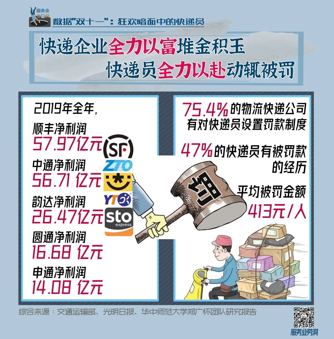 物流行业中,顺丰和“通达系”近年来利润持续增长,仅去年总净利润就超过171.91亿。然而在企业管理上,这些巨额收入是建立在对400万快递员的严苛管理和剥削上的。“以罚代管”是快递行业通行的管理哲学,送货延迟、客户投诉、签收率不达标等都会被罚款。