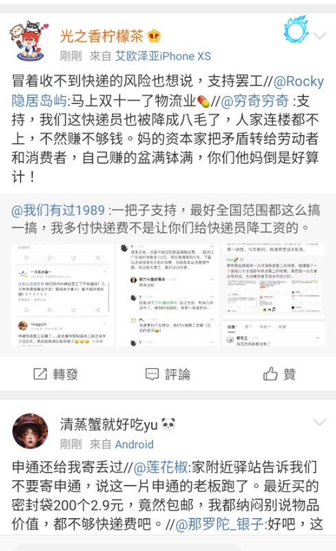 “百度贴吧”搜索结果显示,关于快递罢工的帖子有11609篇,仅近一个月的相关主题贴就有上百篇;近几个月各大快递公司(包括圆通、申通、中通、韵达、顺丰等)的百度贴吧上都有多篇帖子抱怨快递滞留长时间没有派送。新浪微博显示,自2020年1月以来,有超过1000条关于“快递罢工“相关信息,近日讨论井喷,涉及公司涵盖全部四通一达,大部分都是消费者发布的因罢工而导致的快件滞留的抱怨信息。