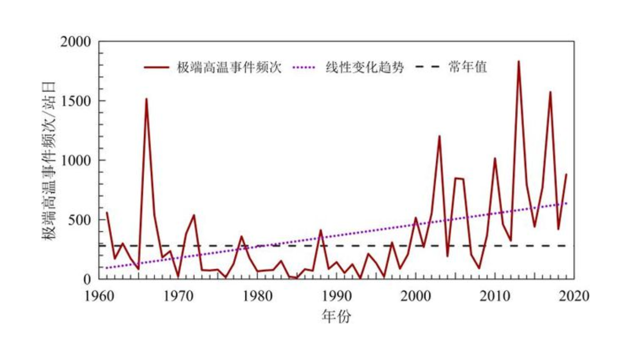 根据中国气象局发布的《中国气候变化蓝皮书(2020)》显示,1961-2019年间,随着平均地表温度的显著上升,极端高温天气也显著增多,热浪频率不断增加。自1961年以来,中国夏季(5月至9月)平均高温日数呈现增强、增多趋势,平均每10年增加0.8天;1993年以来增加幅度进一步加大,平均每10年增加了2.7天,高温热浪事件频发。