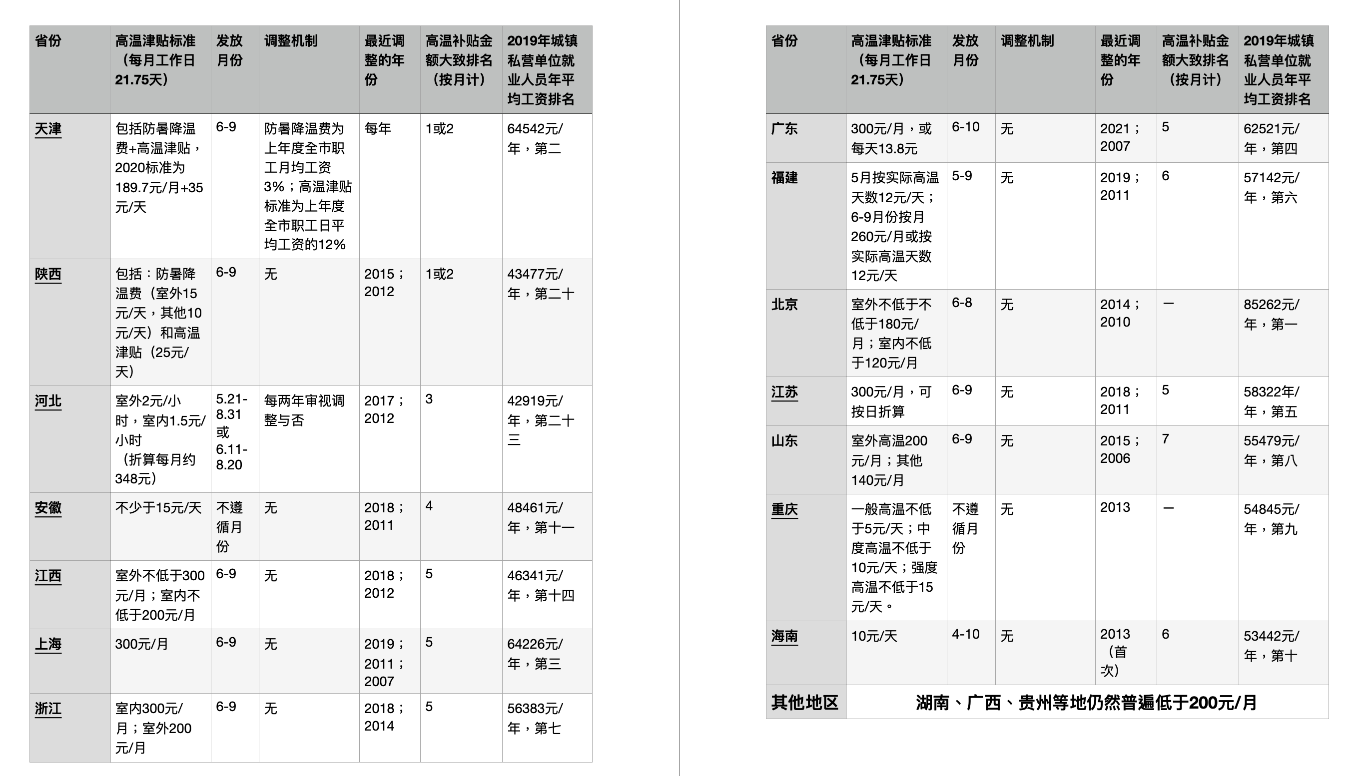 气候变暖在加剧,经济相应地也在腾飞,各地市高温津贴标准是否有相应调整呢?基本都没有,仅天津和河北除外。天津市是第一个将津贴标准真正落实到与职工平均工资挂钩的省市,其高温保障分为防暑降温费和高温津贴,其中防暑降温费为上年度全市职工月均工资3%;高温津贴标准为上年度全市职工日平均工资的12%,每年自动调整。而河北则规定相关部门自2015年起施行每两年审视标准并适时调整的机制,遗憾的是2017年之后并没有落实。