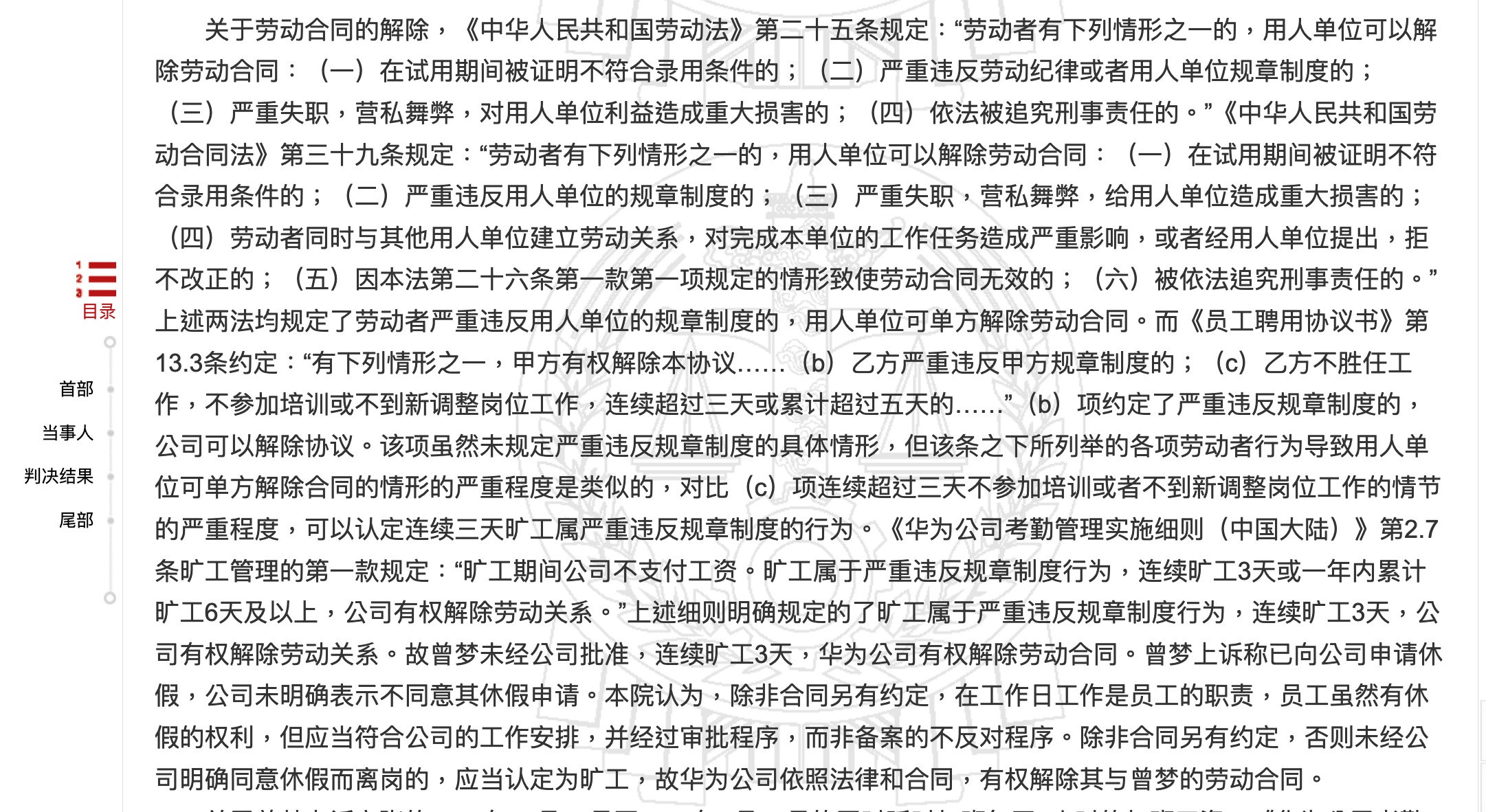 同样在具有争议的是华为内部的规章制度《华为公司考勤管理实施细则(中国大陆)》。二审法官采用的依据是,《劳动法》第二十五条第(二)款规定规定:“劳动者有下列情形之一的,用人单位可以解除劳动合同:(二)严重违反劳动纪律或者用人单位规章制度的”及《劳动合同法》第三十九条“(二)严重违反用人单位的规章制度的…(可以解除合同)”。而华为内部规章强调,“旷工属于严重违反规章制度行为,连续旷工3天或一年内累计旷工6天及以上,公司有权解除劳动关系。”。据此,法官认可华为内部规章合法性,并支持“旷工三天”是严重的违章行为,裁定解雇合法。