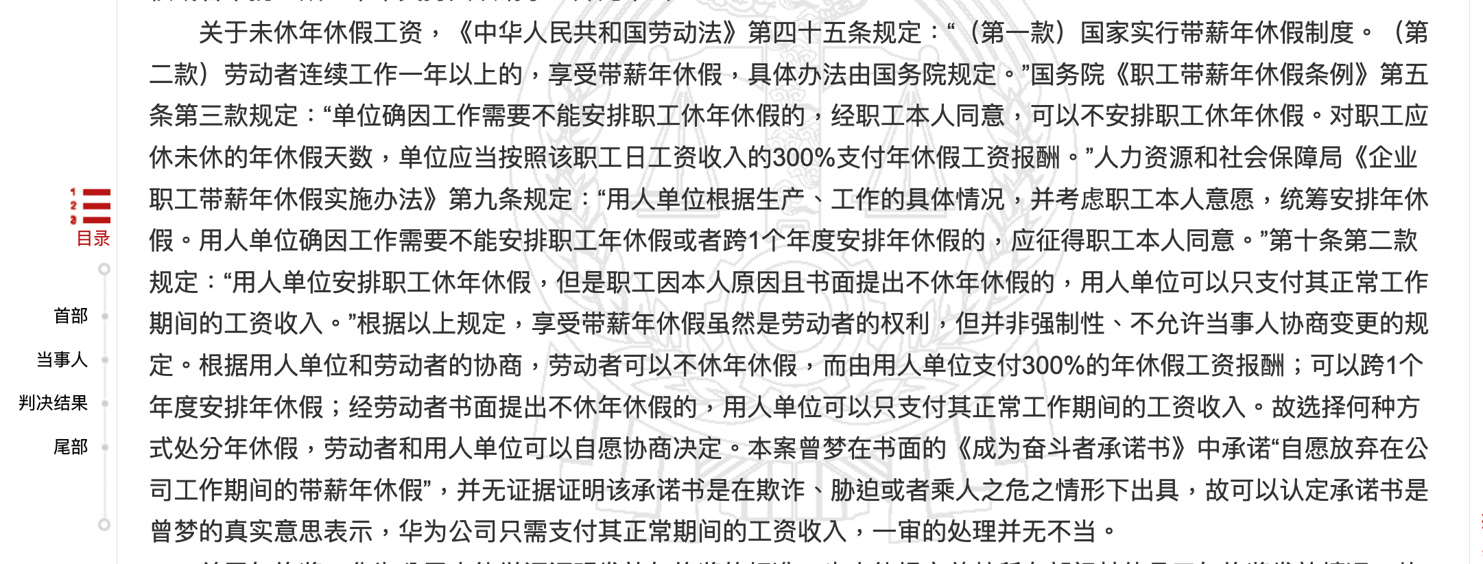 在未休年休假的裁决上,二审判决中引用《企业职工带薪年休假实施办法》第十条第二款规定:“用人单位安排职工休年休假,但是职工因本人原因且书面提出不休年休假的,用人单位可以只支付其正常工作期间的工资收入。”,以此来裁决,在书面提出和放弃权力下,华为可以只支付曾梦正常工作期间的工资收入。这一条款本身存在很大吊诡之处,劳动者怎么可能会主动要求不休年休假且不领取三倍工资,并额外正常上班呢?但不管怎么样,它被写在了实施办法中了。
