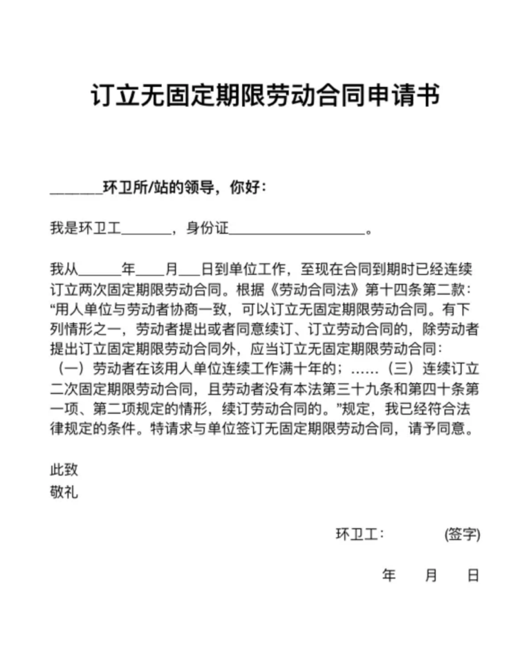 以下是申请书的样板,以环卫工为例,各位工友可以保存图片后打印出来使用:
