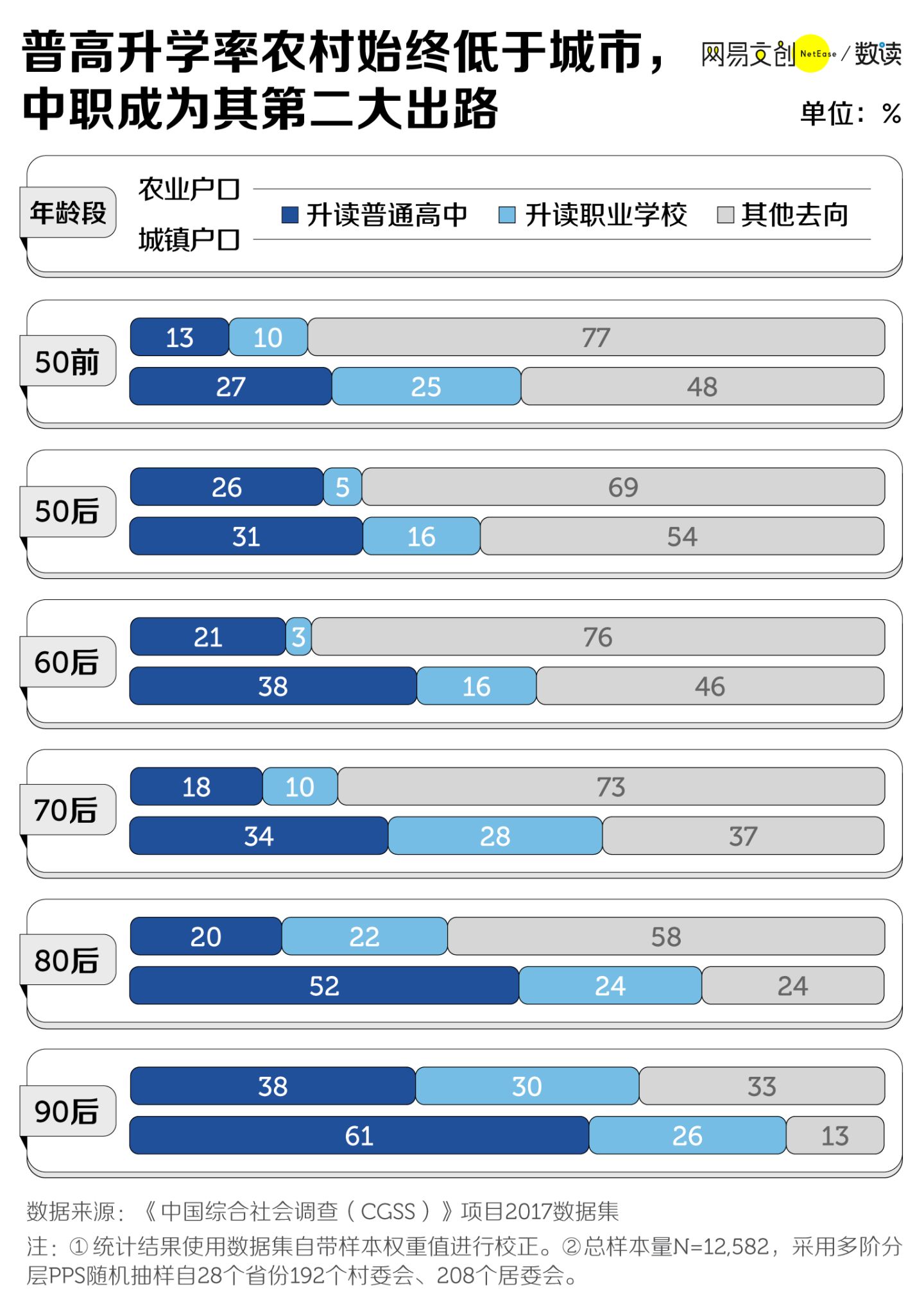 实际上,受“普职分流”影响最大的是农民家庭与外来务工家庭。毕竟,中等职业学校的学生主要是来自农村贫困家庭的孩子和被排斥在城市教育体系外的流动儿童。在许多城市,受到户籍制度的限制,大多数流动儿童在初中毕业后没办法升入所在城市的公办普高,要么留在城市念中职,要么回老家。对于农村学生来说,由于教育资源集中化,职业教育可能是TA们继续接受教育的唯一途径。