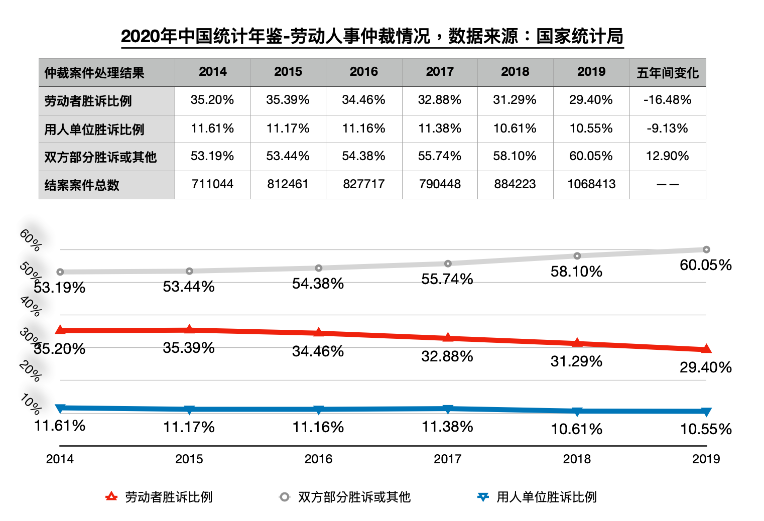 再者,仲裁成功率并不乐观。《中国统计年鉴2020》统计显示,2014-2019五年间每年受理仲裁案件逐年上涨,但劳动者一方单独获胜的裁决比例却在逐年下降,从35.20%下降到29.40%。这有劳动者证据准备上的缺陷与弱势的原因,同样有机制对资方的倾斜,更“玩得转”这套游戏规则——资本可调动整个组织的资源(时间、金钱和法律专业)对抗孤立个体劳动者:劳动者是在兼职打官司,但资方并不是。2019年结案的106+万个劳动仲裁案中,有超过48万的劳资争议最终上诉到法院阶段,这也意味着近一半的争议并不能在仲裁阶段结案,而劳动者必须花更多时间和金钱与资方(被)玩“法律游戏”。