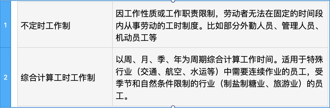 特殊工时管理制度并非新鲜事物,1995年实施的《劳动法》早已有了它的存在。劳动法中最常见、应用最广泛的是标准工时制,也就是我们熟悉的每日8小时、每周5天的工时制,特殊工时制度则包括了不定时工作制与综合计算工时工作制两种,具体适用情况如下: